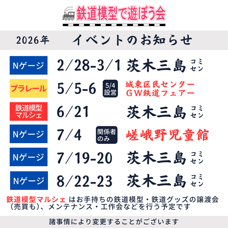 子どもから大人まで、誰でも気軽に参加できる鉄道模型サークルです。大阪府茨木市の三島コミュニティセンターを活動拠点として、ほぼ毎月、運転会を開催しています。